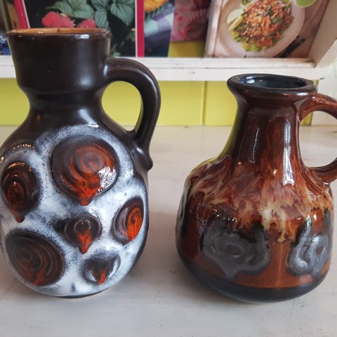 Høye vasen med glasur i bruntoner er 21 cm høy. Den mindre krukken med sjøgrønn glasur er 15,5 cm høy. Røff uglasert struktur nederst på begge.