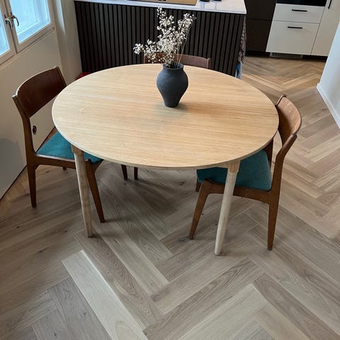 Bordet vises ofte på Bolia sine sider der det er rundt, men vi har ofte brukt ileggsplaten for å forlenge det. Platen er i samme treslag og går sømløst i ett med bordplaten. Ileggsplaten følger med – den kostet ca. 3 000 kr ekstra da vi kjøpte bordet.
