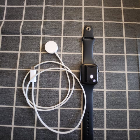 Apple Watch SE GPS 40 mm med hvit silikonrem. Klokken har GPS, Wi-Fi, 32 GB lagringskapasitet, hvorav 27,48 GB er tilgjengelig. Modellnummer og versjon 11.5 (21T572). Passer for brukere som ønsker en smartklokke med fitness- og helsefunksjoner.