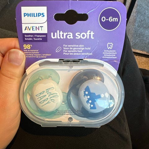 Philips Avent Ultra Start smokk i 2-pakning, designet for nyfødte 0-2 måneder. Smokkene er ortodontiske og laget med materialer som er trygge for spedbarn. Fargene er lilla og beige.