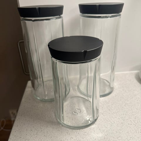 Rosendahl glasskrukker med lokk, sett med tre i ulike størrelser. Krukkene er laget i klart glass og egner seg til oppbevaring av matvarer eller andre små gjenstander på kjøkkenet. Selges samlet.