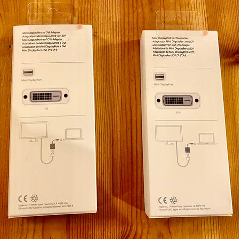 "1 Apple Mini DisplayPort til DVI og 1 av annet merke til HDMI. Disse adapterne brukes for å koble enheter med Mini DisplayPort-utgang til skjermer med HDMI- eller DVI-inngang."