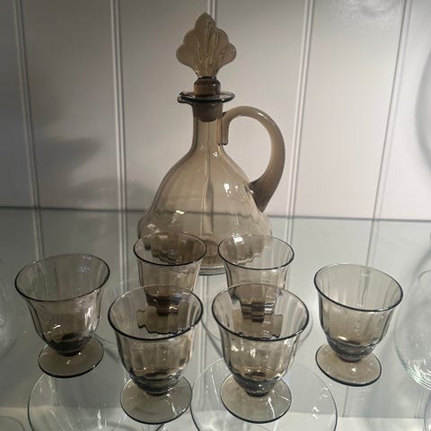 Et sjeldent og stilrent sett – perfekt til likør, dessertvin eller som dekorasjon i vitrineskap.