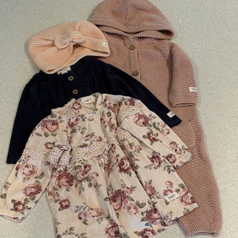 Nye klær fra Newbie i str.62/68 til en nydelig baby jente selges. Disse ble kjøpt for rundt 1000kr for min jente, men dessverre passet de ikke da jeg skulle ta de i bruk. Strømpebukser er fra MP og er pent brukt.