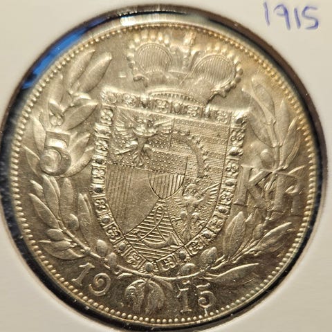 5-kronemynt fra 1907, preget i Østerrike-Ungarn under keiser Franz Josef Is regjeringstid.