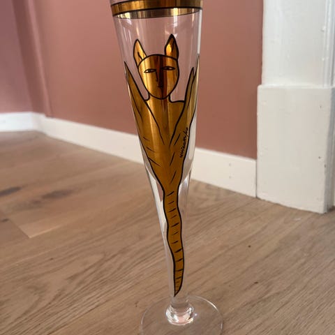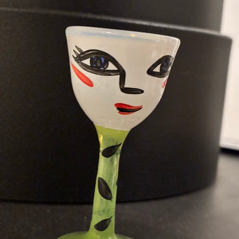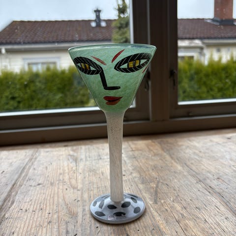 Flott snapsglass/likørglass fra Kosta Boda - Open Minds - signert Ulrika Hydman-Vallien selges for kr 900,-.