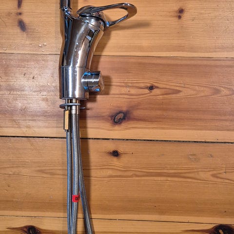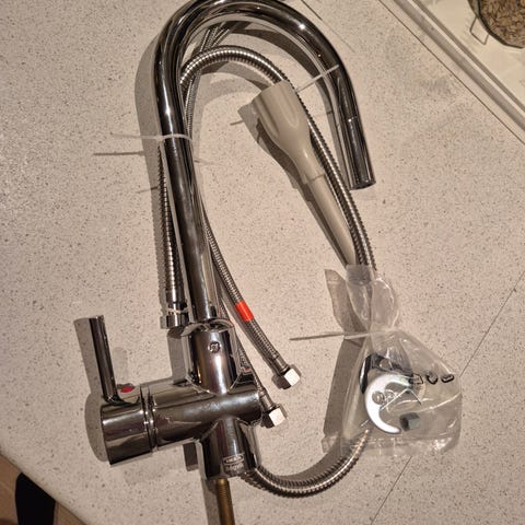 Delsjön Kjøkkenkran. Tinnfarget. Kun åpnet eska og skrudd fast i vannrør, for så bli tatt løs og lagt inn igjen. Hadde to kjøkkenkran å velge mellom.