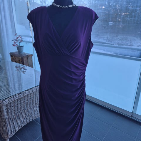 Kjolen er laget i et tungt og eksklusivt jerseystoff som faller nydelig og sitter pent på kroppen. Den er pent brukt, uten skader eller mangler, og fremstår som svært velholdt. Perfekt til bryllup, galla eller andre festlige anledninger. Perfekt i jule-sesongen!