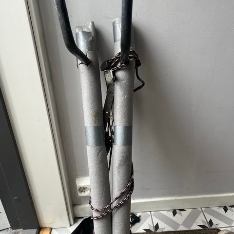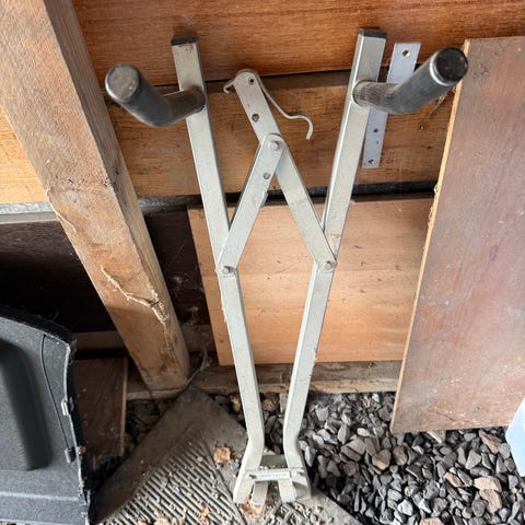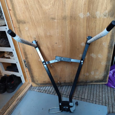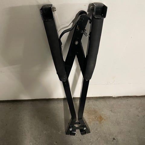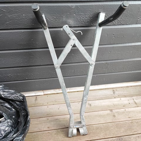 Sykkelstativ sammenleggbar stativ laget av metall til slepekrok på bil. Designet for enkel transport og oppbevaring ved å kunne foldes sammen.
