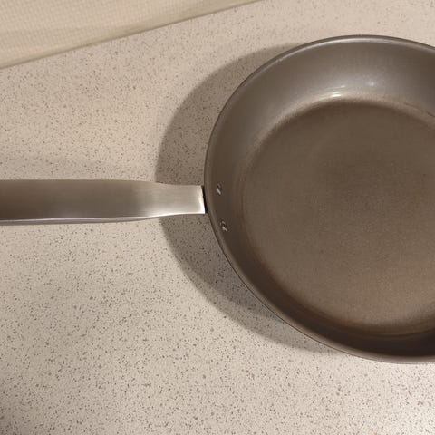 Stekepanne laget av kobber med jernhåndtak. Stekepannen har et rundt design og viser tegn på bruk. Passer til dekorasjon