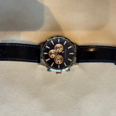 Hauger herreklokke med sort urskive og skinnrem. Klokken har kronograffunksjon og viser dato. Remmen er svart på utsiden og brun på innsiden. Leveres i original trekasse. Seriøse bud vil bli vurdert.