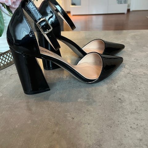hæler i størrelse 39 for dame. Skoene er svarte og har en blokkhæl. Materialet har en blank finish, og skoene har ankelrem med spenne for justering.