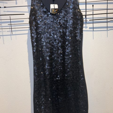 Mango festkjole i størrelse S, svart farge. Kjolen har korte ermer og er dekorert med paljetter som gir et glitrende utseende. Materialet er mykt og har et glansfullt uttrykk. Liten splitt i kjolen på fremsiden.