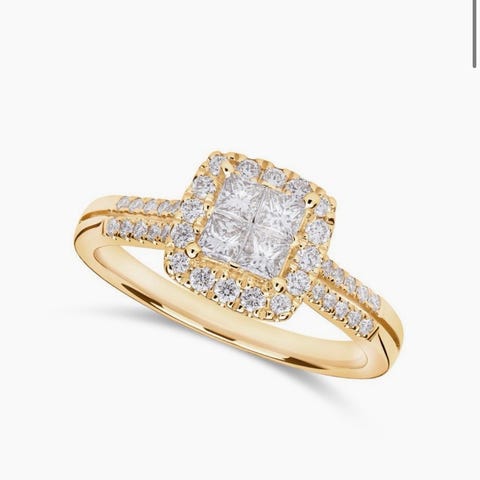 Ringen har et elegant og tidløst design, med en glitrende diamant-ramme rundt midtpartiet og diamanter langs ringskinnen. Passer perfekt som forlovelsesring, gave eller til deg som vil unne deg noe spesielt.