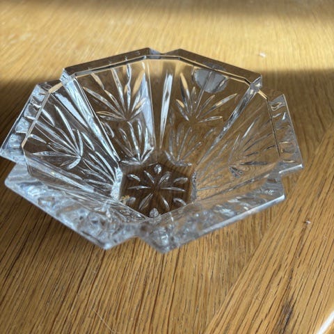 Krystallglass skål med rund form og dekorative mønstre. Egnet for oppbevaring eller servering av små gjenstander eller matvarer.