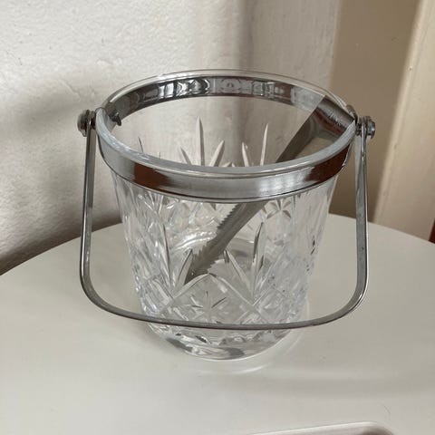 Krystallskål til isbiter med metallhåndtak. Passer til servering av isbiter ved ulike anledninger. Gjennomsiktig materiale med dekorative mønstre.
