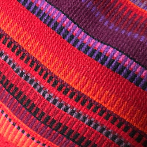 Materiale er Åklegarn farget med rotpulver fra Krapp-plante, Kaktuslus (Corsenille), Islandslav, og Slørsopp. Vevet på hamp rennning.