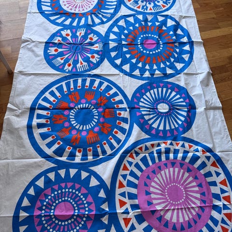 Bredde og lengde er i overkant av 120cmx290cm. Delvis sydd kant som kan sprettes opp, blir da noen flere mm der, se bilde. Ser ikke ut som det er brukt, men har et lite merke i stoffet, se bilde. Trenger strykes