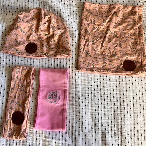 Rosa Reflex lue og hals str 2 år i 100% merinoull og lyseblått, strikket pannebånd selges samlet til kr 100,-. Halsen har dessverre et par flekker, men er ellers av god kvalitet.