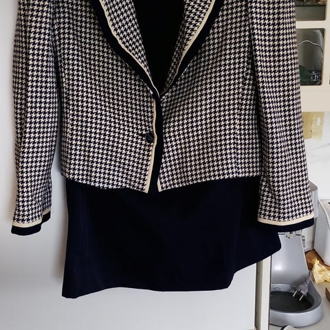 Danny & Nicole, svart kjole i størrelse M/L. Kjolen er i et lunt og godt stoff, har ermeløst design og rett passform. Den er fin både med og uten belte. Skult glidelås i ryggen. Tilhørende morsom jakke i pepitamønster. Kjolen passer for alle anledninger, fint antrekk både med og uten jakke. Et kjempefint antrekk som kanskje ingen andre har.