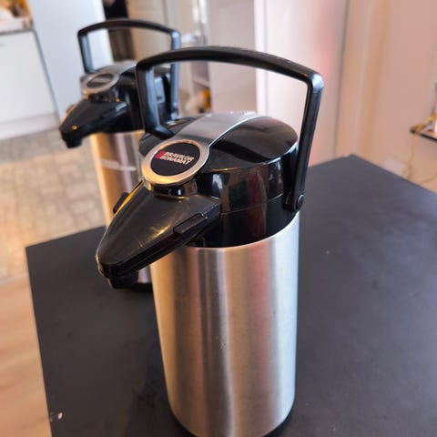 Kaffe, te, drikke, kanne, termos, flaske, kjøkken, stue, kaffetrakter, kaffekjel, kokekaffe, husgeråd, salongbord, perculator, perkulator, presskanne, kaffefilter, spisestue, tv, sofa, termokanne, servise, servering, vannkoker, pulverkaffe, selskap, gjester.