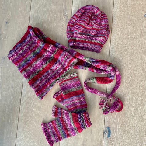 Stripete lue med fleece inni, og skjerf. Luen er str 54/56, skjerfet er one size. Litt nupper på luen. Glittertråd i både luen og skjerfet.