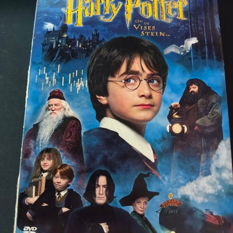 Harry Potter og De vises stein DVD med original omslag. Filmen er basert på J.K. Rowlings bokserie og følger Harry Potter i hans første år på Galtvort skole for hekseri og trolldom.