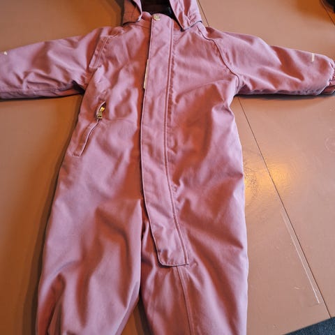 Name it Barne Vinterdress i størrelse 104, unisex modell i lilla farge. Dressen har hette, glidelås foran og elastiske mansjetter ved armer og ben. Materialet er vannavstøtende og foret med fleece på innsiden for ekstra varme. Egnet for bruk i kaldt vær. Har en rift ved rompen og mangler begge stroppene nede ved bena