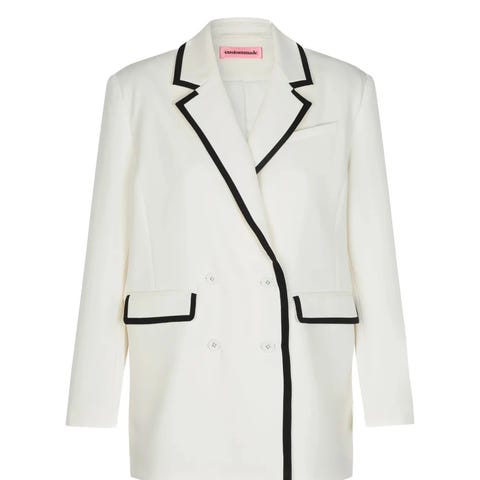 Falippa fra Custommade. En stilig hvit blazer med sorte kontrastkanter. Blazeren er dobbeltspent og oversized i passformen.