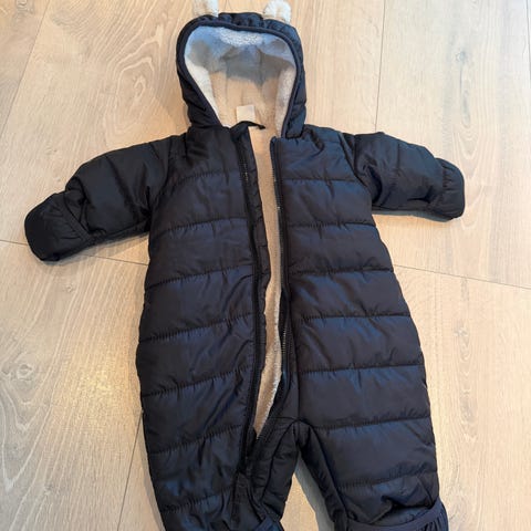 Deilig varm vinterdress til baby med tilhørende votter og fotposer. Brukt to ganger, den er så god som ny. Str 3mnd, tilsvarer ca 56-62.