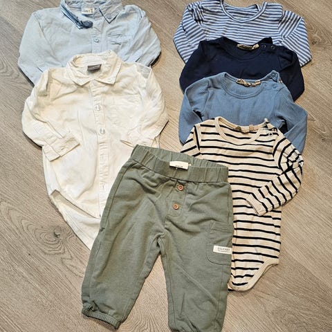 barneklær sett i størrelse 80 for gutt. Sett består av flere plagg i flerfarget design, inkludert bodyer, bukse, skjorte og hettejakke. Materialet er mykt og egnet for barnets komfort. Pent brukt av 1 barn.