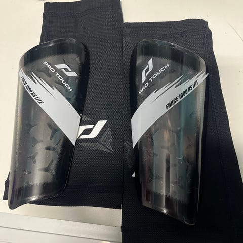 Leggbeskyttere med borrelåsfeste for enkel tilpasning og sikker passform. Str S. Litt slitt foran.