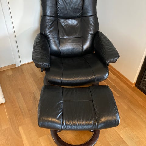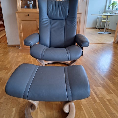 Pent brukt justerbar lenestol i grått skinn fra Ekornes Stressless. Ingen synlig slitasje i skinn eller treverk. Må hentes i Bodø.