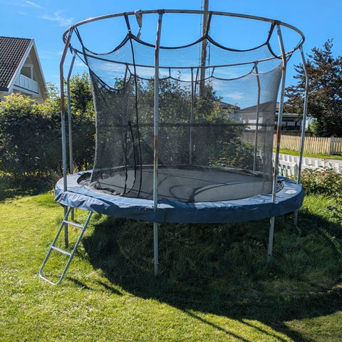 Morsom trampoline for små barn som ikke okkuperer hele hagen. Innvendig diameter ca 1 meter. Trenger en vask, og beskyttelsesplasten på utsiden har revnet et par steder. Gis bort mot henting.