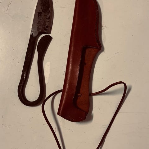 Kniven blir levert med ei slire i brunt vegetabilsk lær og oppheng for belte.