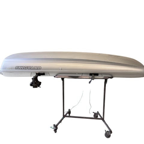 Med Thule takfeste. En del riper på toppen og knekt håndtak, men ellers er boksen og takfeste i god stand.