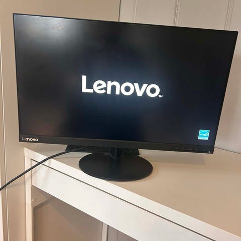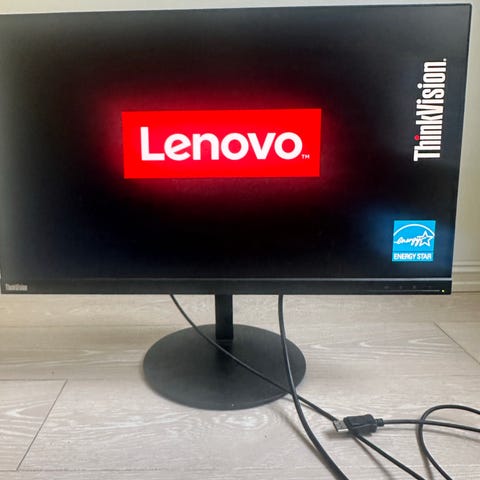 Lenovo ThinkVision 27" skjerm med HDMI-inngang. Skjermen har en størrelse på 27 tommer og har en rund, stabil fot. Passer til bruk som dataskjerm for kontor eller hjemmebruk.
