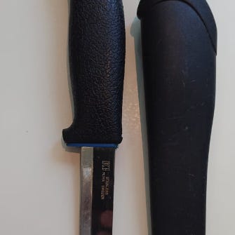 Morakniv CF Stainless Steel kniv med blått plastisk håndtak og svart plasthylster. Kniven har et rustfritt stålblad og er egnet for ulike bruksområder som friluftsliv, matlaging eller håndverk. Ca 21,5 cm lang. I etuiet ca 23 cm.