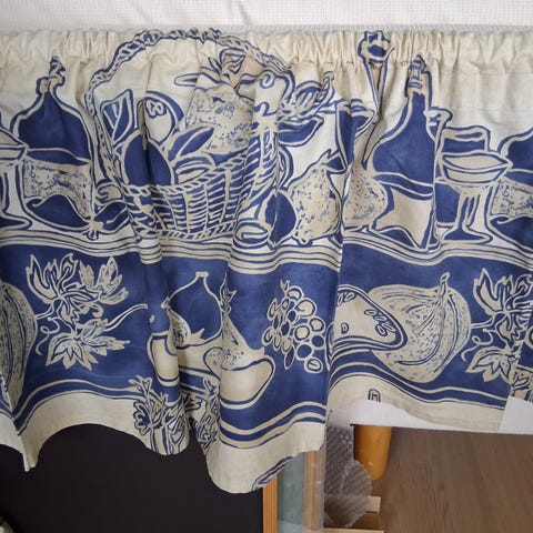 Flotte farger, blå kant nederst. 270x31 cm. Kappen er helforet. Stoffet er blitt litt