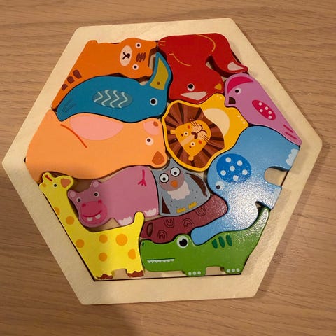 Puslespill av dyr og hva de spiser i Tre består av 6 fargerike brikker med forskjellige dyremotiver som panda, sjiraff, løve, bie, mus, frosk, pinnsvin, ekorn, kanin, flodhest, bjørn, hval og krabbe. Puslespillet er laget av tre og har en ramme for enkel plassering av brikker. Egnet for barn som ønsker å lære om dyr og utvikle finmotorikk.