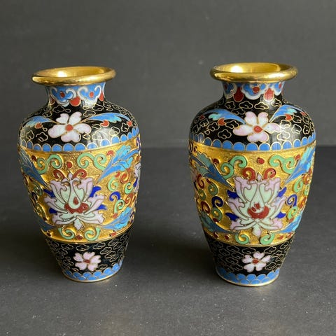 Selger et vakkert par kinesiske vaser i metall med håndemaljerte detaljer, trolig cloisonné-arbeid. Vasene har vært i familien i generasjoner og antas å være fra 1930-tallet eller tidligere.