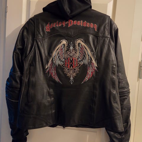 Harley Davidson Damejakke. , laget av ekte skinn. Jakken har detaljer som nagler og frynser på ermene, samt Harley-Davidson-logo på ryggen. Designet for kvinner, egnet til motorsykkelbruk og fritid. Str XL. Srlges kr 3.900,- pluss porto.