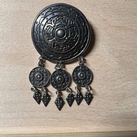 Nydelig filigran håndlaget brosje antakelig i 830S sølv og med innfelt rød perle, tilynelatende laget i Midtøsten, muligens i Jerusalem. Alle detaljene er montert, ikke preget, som bildene viser. Det er en imponerende teknikk som her er brukt. Motivet for smykket kan ha vært et seremonielt skjold. Andre varianter av smykket hadde flere perler innfelt. Brosjen har lås for nålen (baksiden, se bilde).