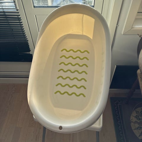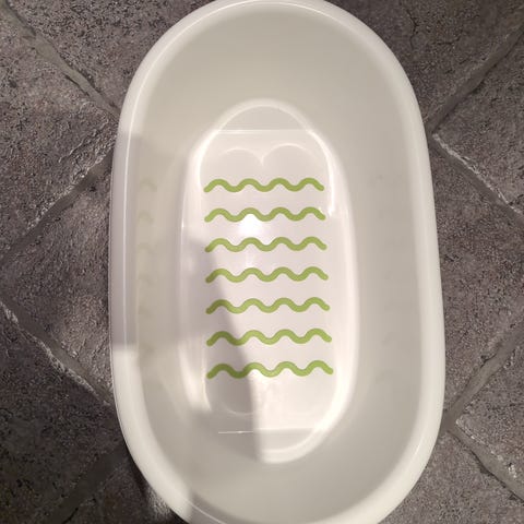 Yngri babybadekar i grå plast. Passer for spedbarn og småbarn. Designet for bruk i hjemmet for enkel bading av babyer. Laget av slitesterkt materiale som er lett å rengjøre.