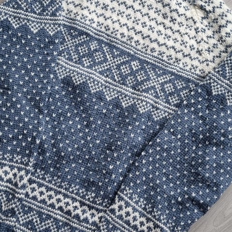 Hjemmestrikket knall blå ullgenser, str. XL. Strikket i strukturmønster, i pelsullgarn (100% ull) fra Hillesvåg ullvarefabrikk. Brukt en gang.