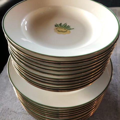 5 flotte desserttallerkener/frokosttallerkener i hvit porselen med gullkant. Fremstår som svært pene. Ingen skår eller slitasje på gullkanten. Ø17,5 cm.
