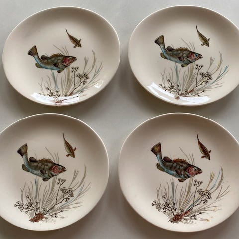 Frokosttallerkner, 21cm i diameter. 4 stk med krakeleringer: 70,- pr stk. 1 stk med krakeleringer+ et lite skår på undersiden av kanten: 50,-