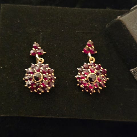 Skru øredobber i gull 585, dråpeformet. Laget av gullsmed Elvik i mellomkrigstiden. Vekt ca 2 gram.