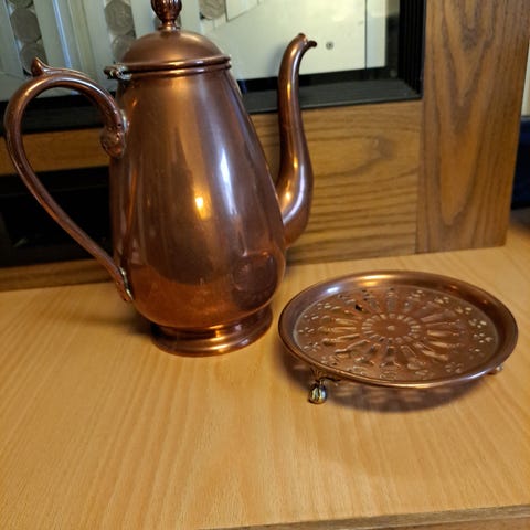 Selges håndlaget kaffesett. ( materialet er kobber ) pris 150