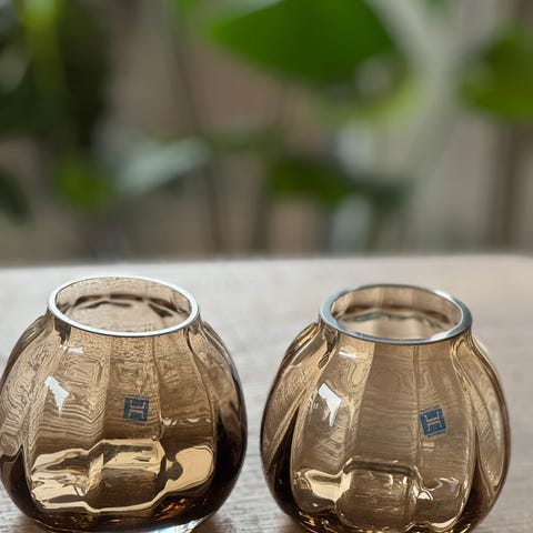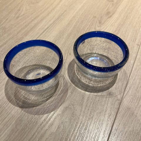 De er ca 9 cm i diameter i toppen og 7 cm høye. Passer fint til telys. Kjøpt